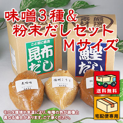 味噌3種&粉末だしセット Mサイズ 送料無料 信州こうじ味噌 仙台こし味噌 麦みそ カツオだし 昆布だし 粉末だし