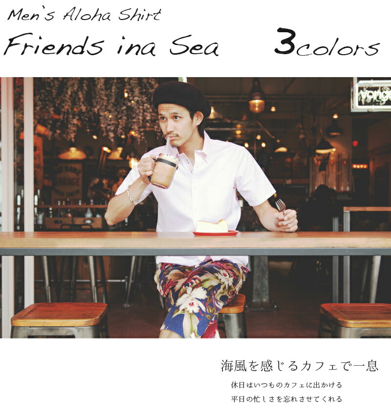 かりゆしウェア メンズ アロハシャツ 沖縄版 かりゆし ココナッツジュース シャツ 結婚式 Friends in a Sea 全3色 人気かりゆしウェアがリニューアル 半袖 3L 大きいサイズあり 送料無料